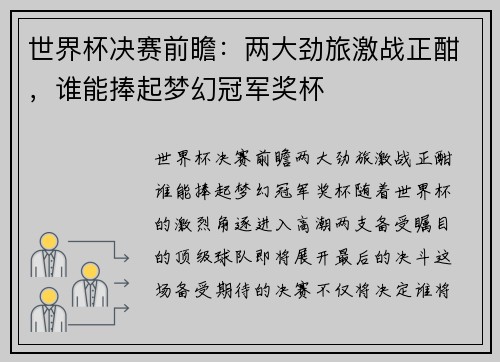 世界杯决赛前瞻:两大劲旅激战正酣,谁能捧起梦幻冠军奖杯?随着世界杯的激烈角逐进入高潮,两支备受瞩目的顶级球队即将展开最后的决斗。这场备受期待的决赛不仅将决定谁将登上世界足球的巅峰,更意味着一段历史的缔造与未来的传奇。文章将从四个关键方面来探讨这场决赛的前景:球队阵容的对比、战术策略的博弈、球员的个人表现、以及心理战的较量。这场激烈的对决,不仅仅是两支球队的对抗,更是足球文化和精神的碰撞。最终,谁能捧起梦幻冠军奖杯,成为历史的新篇章,将是本场比赛的最大看点。