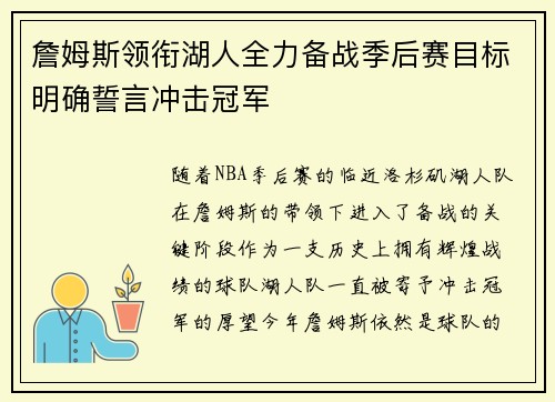 随着NBA季后赛的临近,洛杉矶湖人队在詹姆斯的带领下进入了备战的关键阶段。作为一支历史上拥有辉煌战绩的球队,湖人队一直被寄予冲击冠军的厚望。今年,詹姆斯依然是球队的核心,尽管他已经进入职业生涯的晚期,但凭借着出色的竞技状态和丰富的经验,詹姆斯仍然是球队的绝对领导者。为了实现目标,湖人队全力以赴,在各方面都做出了相应的调整和准备。本文将从四个方面详细阐述詹姆斯领衔湖人全力备战季后赛、目标明确誓言冲击冠军的过程,包括球队的整体备战策略、詹姆斯个人的状态与贡献、湖人队的阵容变化以及他们的季后赛前景。通过对这些方面的分析,我们可以更好地理解湖人队如何备战即将到来的季后赛,并为球队的最终目标——夺取NBA总冠军奠定基础。