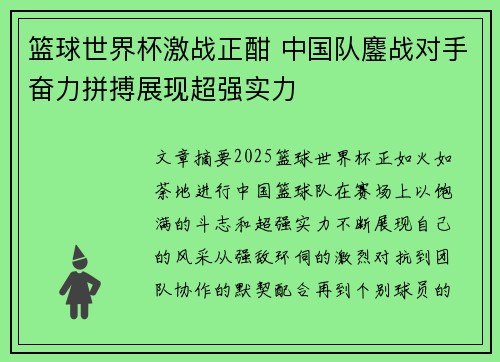 文章摘要:2025篮球世界杯正如火如荼地进行,中国篮球队在赛场上以饱满的斗志和超强实力不断展现自己的风采。从强敌环伺的激烈对抗到团队协作的默契配合,再到个别球员的惊艳表现,中国队一路鏖战,不仅在比赛中拼尽全力,更展现了出色的技术与韧性。无论是团队协作还是关键时刻的个人能力,中国队都展现出了强大的竞技实力与拼搏精神。本文将从四个方面深入探讨中国队在篮球世界杯的表现,包括团队合作、球员状态、战术策略和未来展望等方面,全面解析中国队在世界杯中的精彩表现,给球迷带来一次深刻的比赛体验。